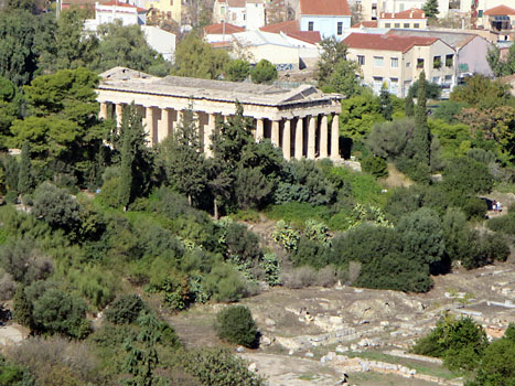 Z Akropole, která je témìø neustále pøeplnìna davy turistù, to máme do staré øecké Agory skoro pár krokù. Vycházíme sloupovím Propylají, pak hlavní bránou a za sebou necháváme zástupy brebentících, všemu se hlasitì divících a všude se pletoucích èínských turistù, které sem pøivezly autobusy z velkých výletních lodí. Od schodištì u Akropole je to jen pár krokù k nevysokému skalnatému pahorku, odkud je snad nejkrásnìjší výhled na hlavní èást Akropole a na celou Agoru na druhé stranì.