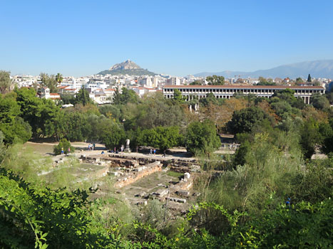 Z Akropole, která je témìø neustále pøeplnìna davy turistù, to máme do staré øecké Agory skoro pár krokù. Vycházíme sloupovím Propylají, pak hlavní bránou a za sebou necháváme zástupy brebentících, všemu se hlasitì divících a všude se pletoucích èínských turistù, které sem pøivezly autobusy z velkých výletních lodí. Od schodištì u Akropole je to jen pár krokù k nevysokému skalnatému pahorku, odkud je snad nejkrásnìjší výhled na hlavní èást Akropole a na celou Agoru na druhé stranì.